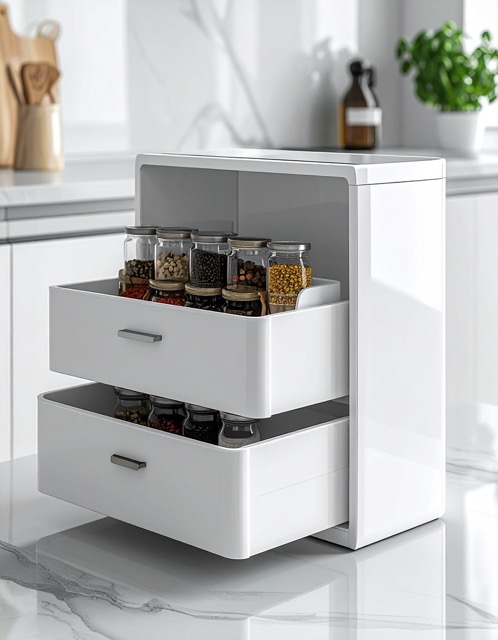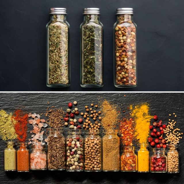 • Everyday spices: in a spice box, rotating rack, or countertop jars