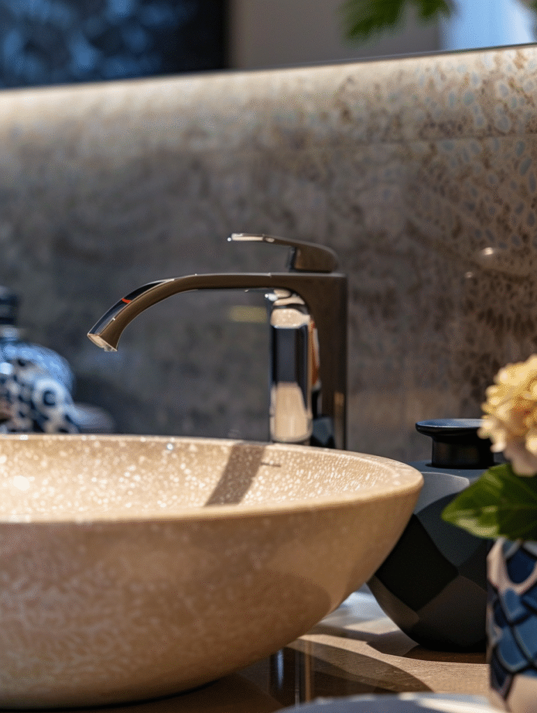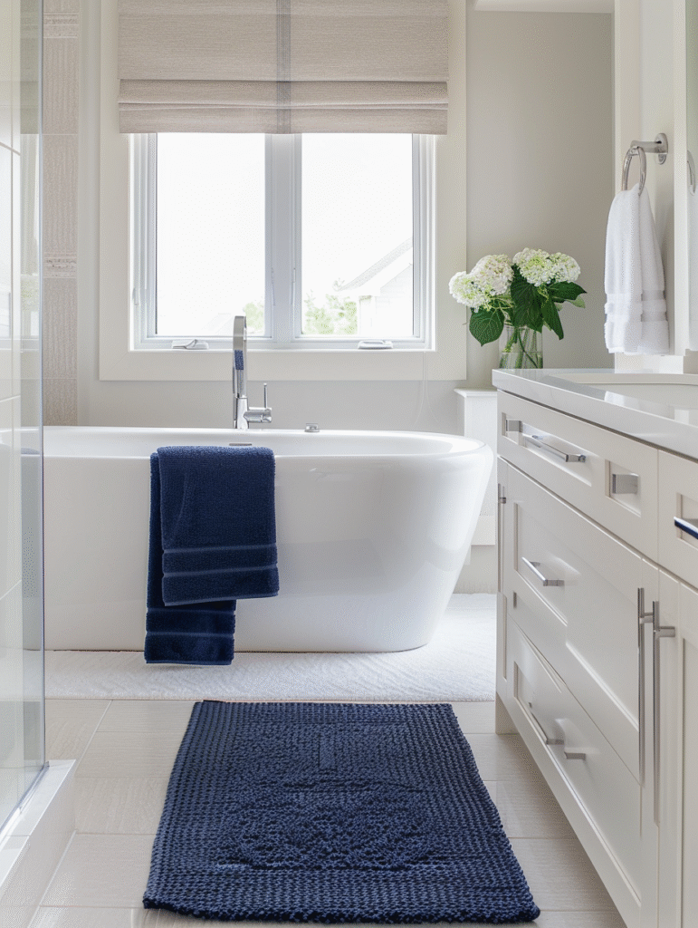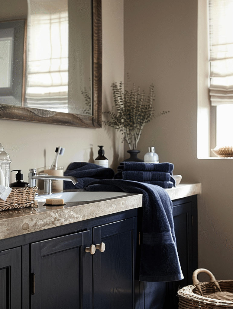 Blue brings a cooler tone into beige bathrooms, but not every shade works equally well. Dark, muted blues such as navy or deep steel blue create a refined contrast without clashing with beige’s warmth. Lighter or overly bright blues can feel disconnected and should be avoided.