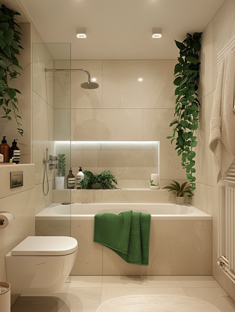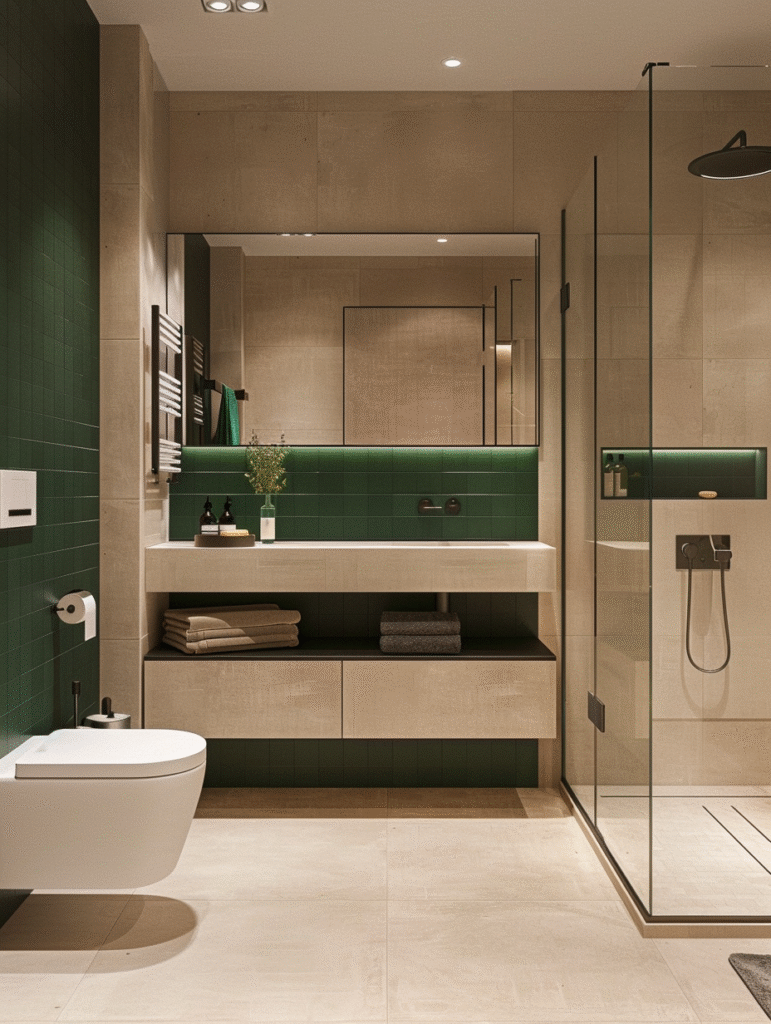 Green is one of the most natural partners for beige. From soft sage to deep forest green, these tones bring a sense of calm and balance into the bathroom. Beige softens green, while green gives beige more life and movement.