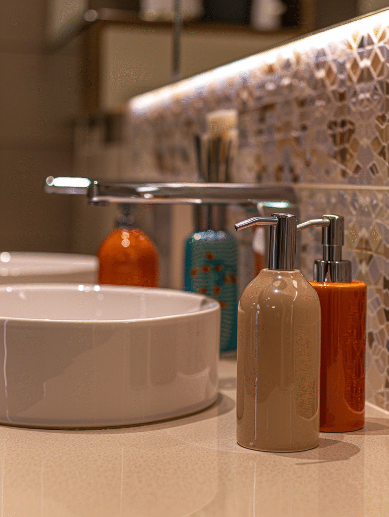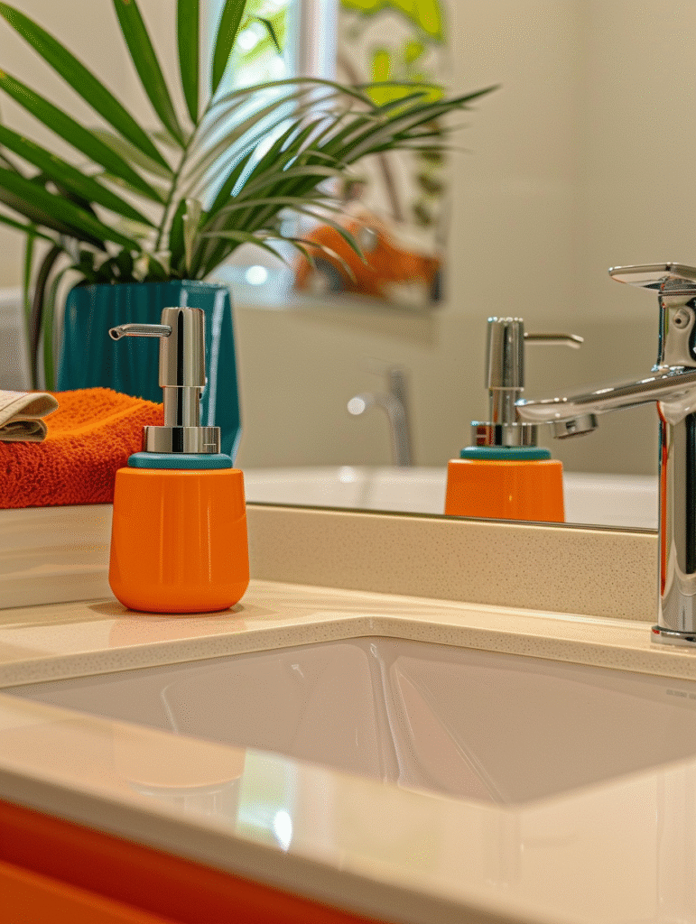 Color pops can appear in unexpected places: tiles, bath mats*, colored vases (we love these colored glass vases in mushroom-design*) with plants, or even everyday items like a colorful soap dispenser*, trash bin, or toilet brush. These small elements are easy to swap out and instantly refresh the bathroom.