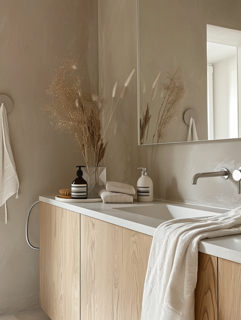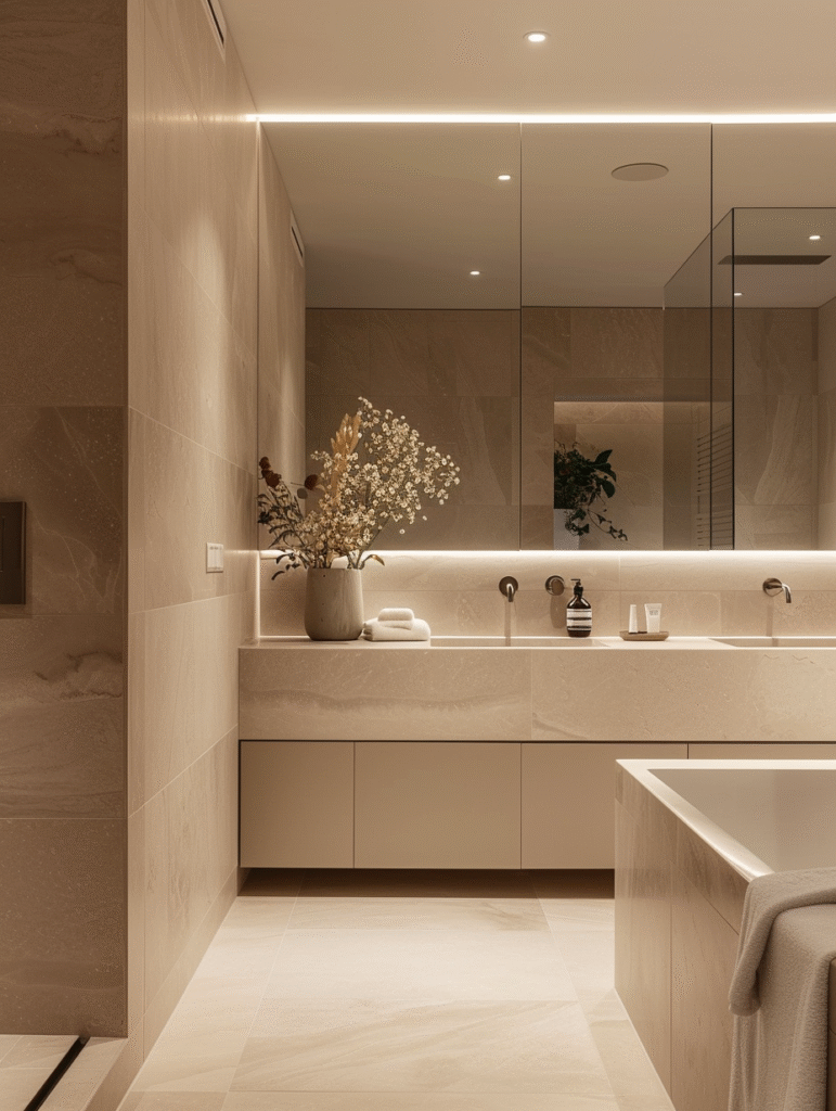 The success of an all-beige bathroom lies in variation, not contrast. Small changes in tone and texture make the space feel alive rather than flat.