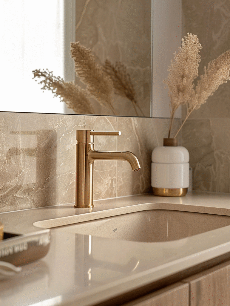 Metallic finishes are an easy way to add sophistication to a beige bathroom. Brushed gold, soft brass, or champagne tones enhance beige’s warmth and add subtle elegance. These finishes work well in mirrors (just look at this golden framed mirror*), lighting, or small decorative details.