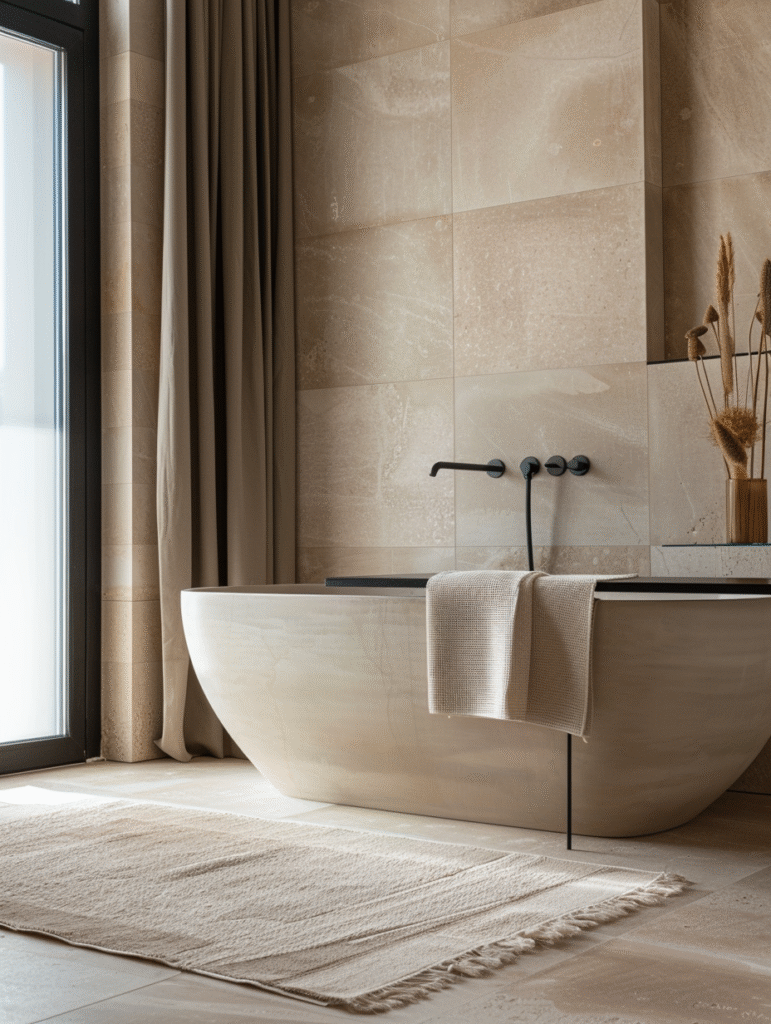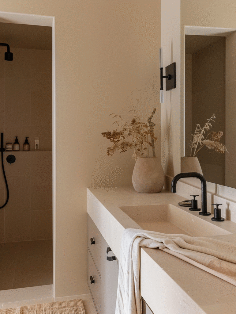 For a more striking and contemporary aesthetic, beige and black is a powerful combination. Black accents add structure and contrast, giving the space a more luxurious and architectural feel. Faucets, shower frames, mirrors, or cabinet handles in black work particularly well.