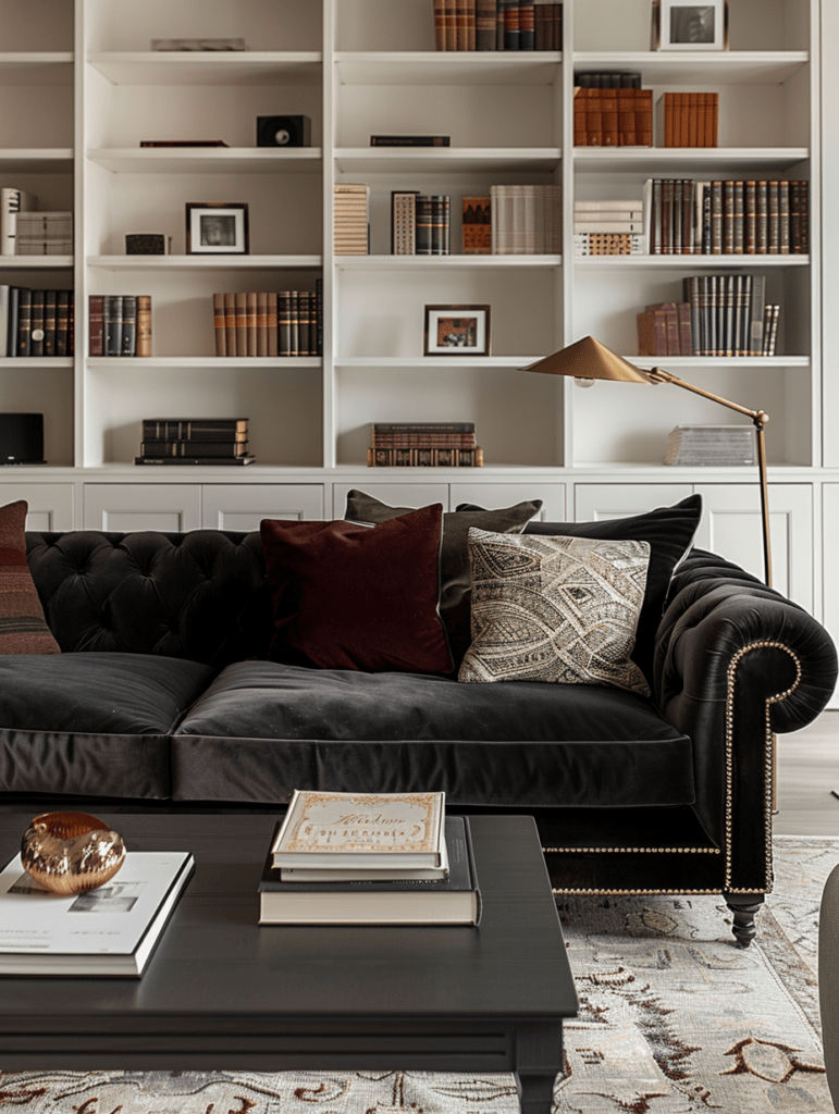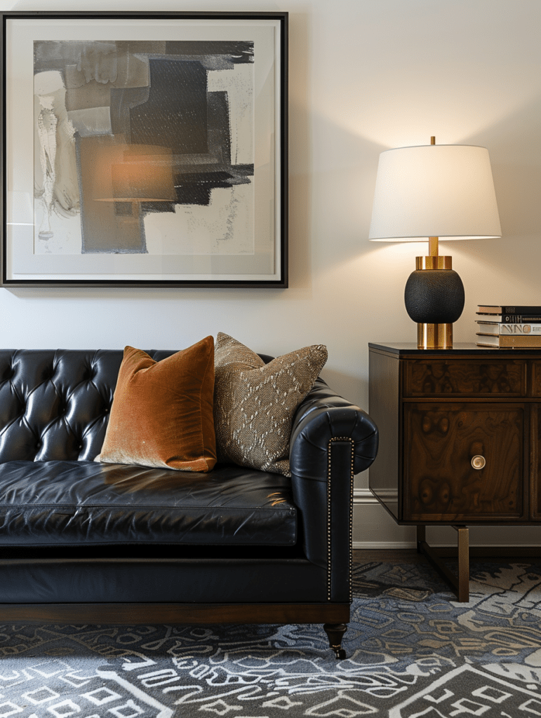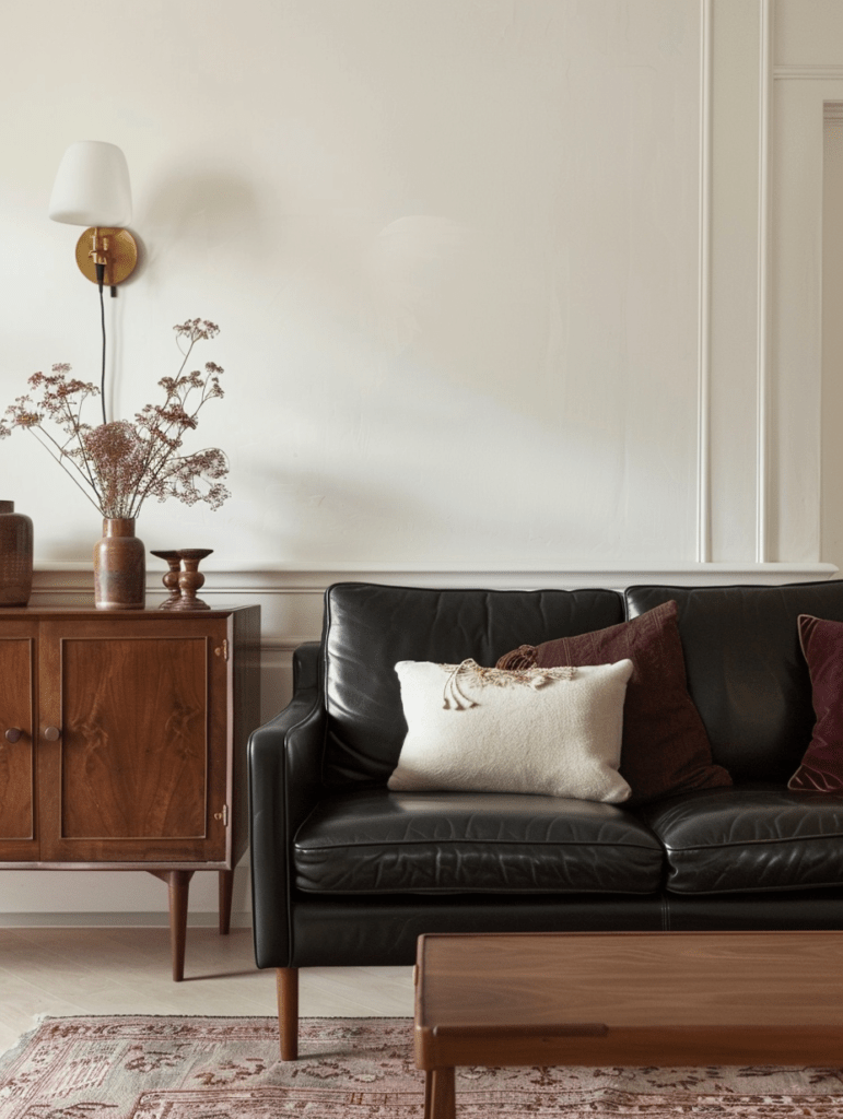 A black sofa in a room full of brand-new, sharp-edged furniture can feel stark. Mixing in vintage or character pieces softens the look immediately.