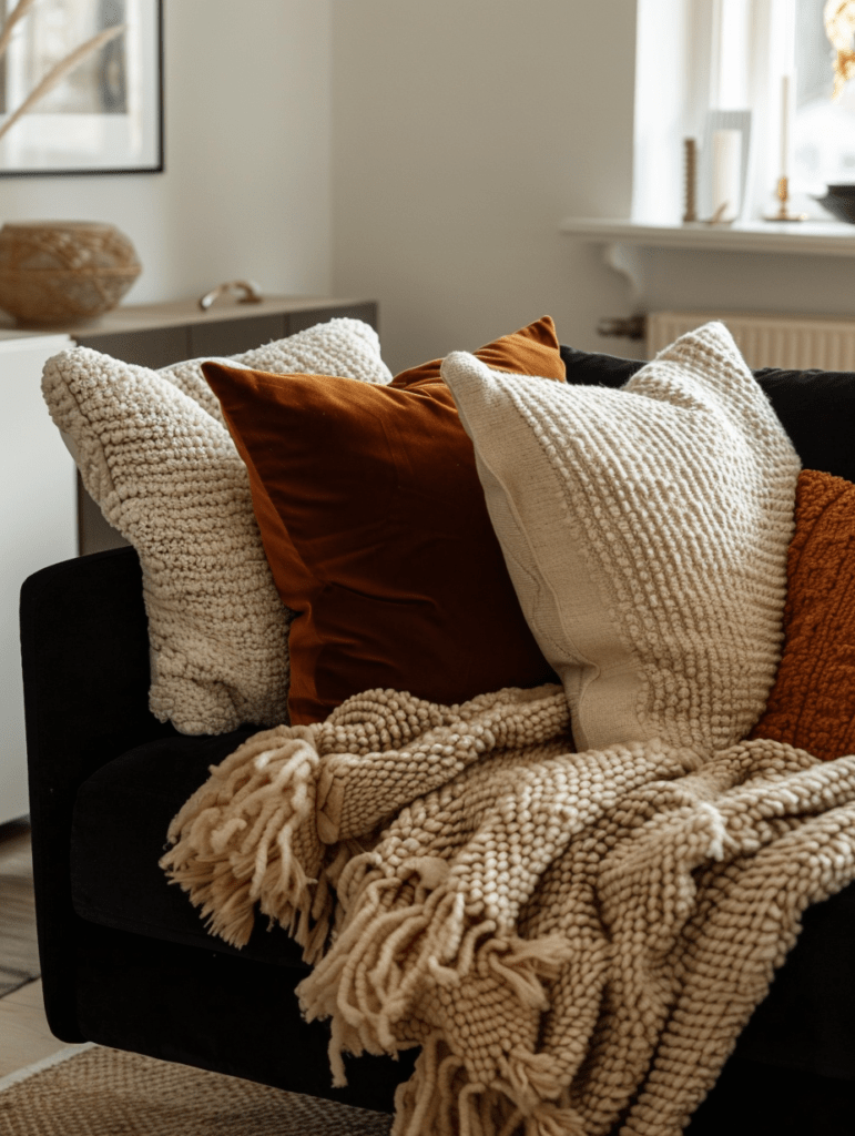 Chunky knit throws, linen cushions, bouclé, soft wool rugs. Cream, camel, warm beige, muted rust. These tones create contrast without turning the sofa into a harsh focal point.