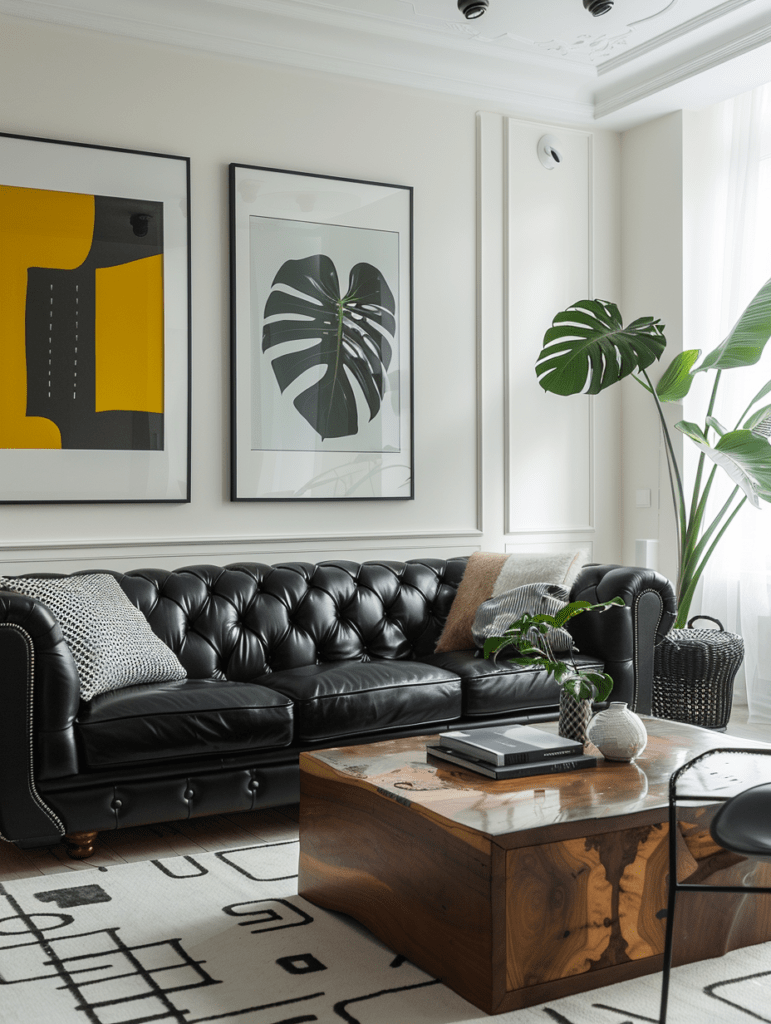 Introduce warmth immediately through wood – walnut, oak, even rustic reclaimed finishes. A wooden coffee table, sideboard, or shelving unit softens the sharpness of the sofa and grounds the space in something natural.