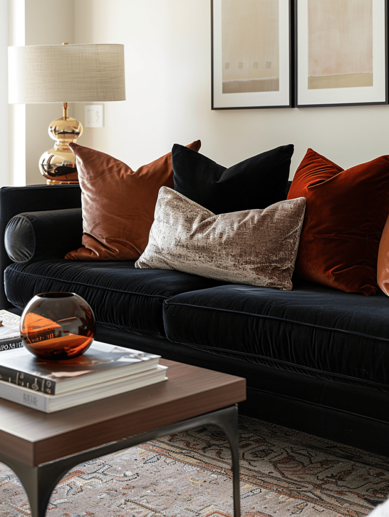A black couch without texture can feel flat. The solution isn’t color overload – it’s fabric.