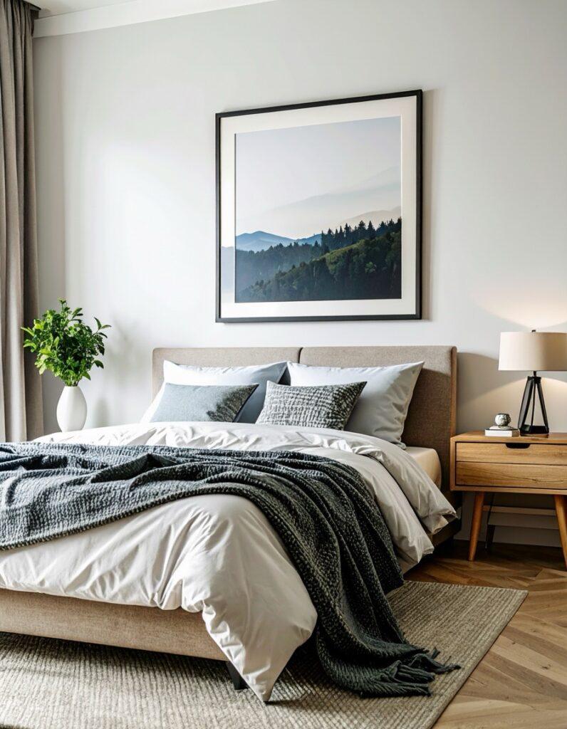 Blank walls make a bedroom feel unfinished. One or two framed prints* or minimalist artwork* above the bed or dresser are enough.