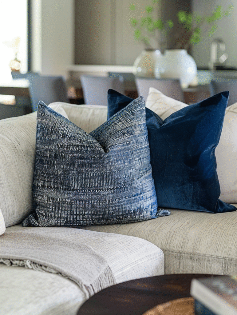 Blue shines most when paired with a neutral foundation. Beige, white, warm wood tones, and even soft gray allow blue accents to stand out while keeping the overall look calm. These base colors soften blue’s coolness and make it feel more livable and timeless.