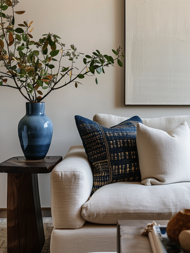 Smaller decorative elements are perfect for testing blue in your living room. Blue vases* with fresh flowers, sculptural objects, ceramic bowls, or curated cushion sets can instantly elevate the space. These accents are easy to swap out and allow flexibility as trends change.
