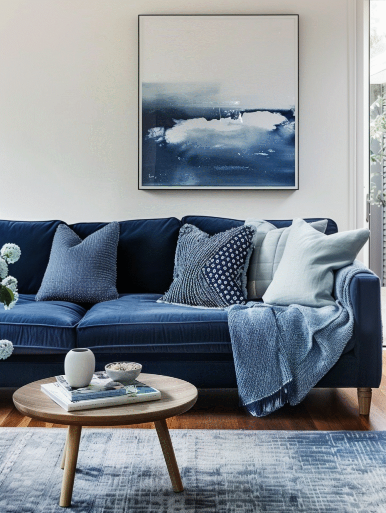 A blue sofa is one of the strongest ways to introduce blue as a statement element. Navy, steel blue, or muted royal blue work particularly well as a focal point without feeling overpowering. When the sofa carries the color, the rest of the room should remain relatively quiet.
