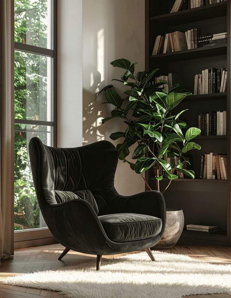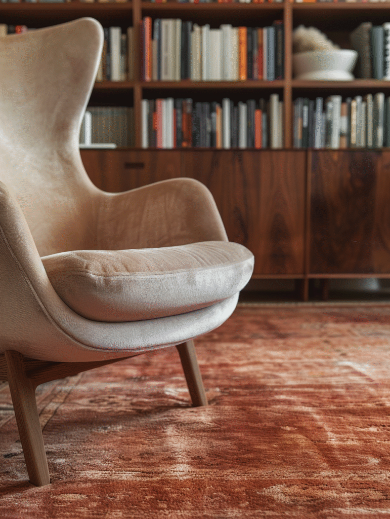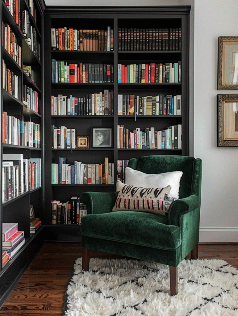 Every mini library begins with a seat that invites you to pause. A softly shaped armchair*, a compact lounge chair*, or a built-in bench* instantly gives the corner purpose. When the chair looks comfortable, the space already feels welcoming.
