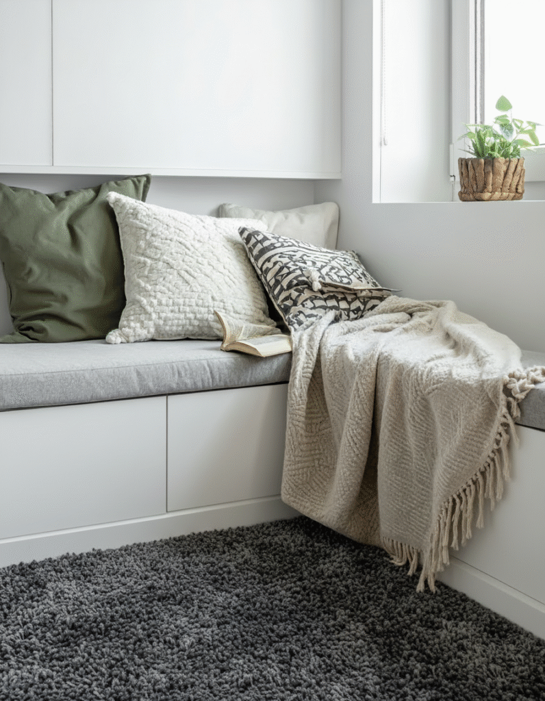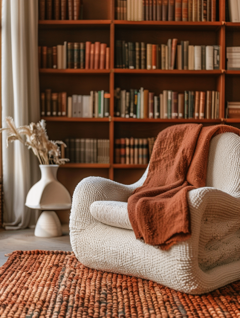 A mini library feels warmer with soft layers. A small rug* underfoot, a cushion, or a lightweight throw adds texture and comfort without crowding the corner. These details make the space feel settled and lived in.