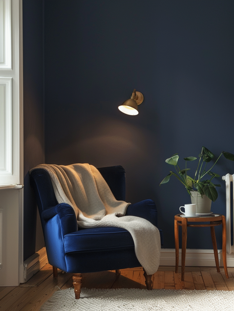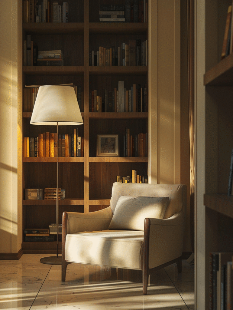 Lighting defines how a reading corner is experienced. A warm floor lamp* or a subtle wall light* creates an intimate glow that feels calm rather than functional.