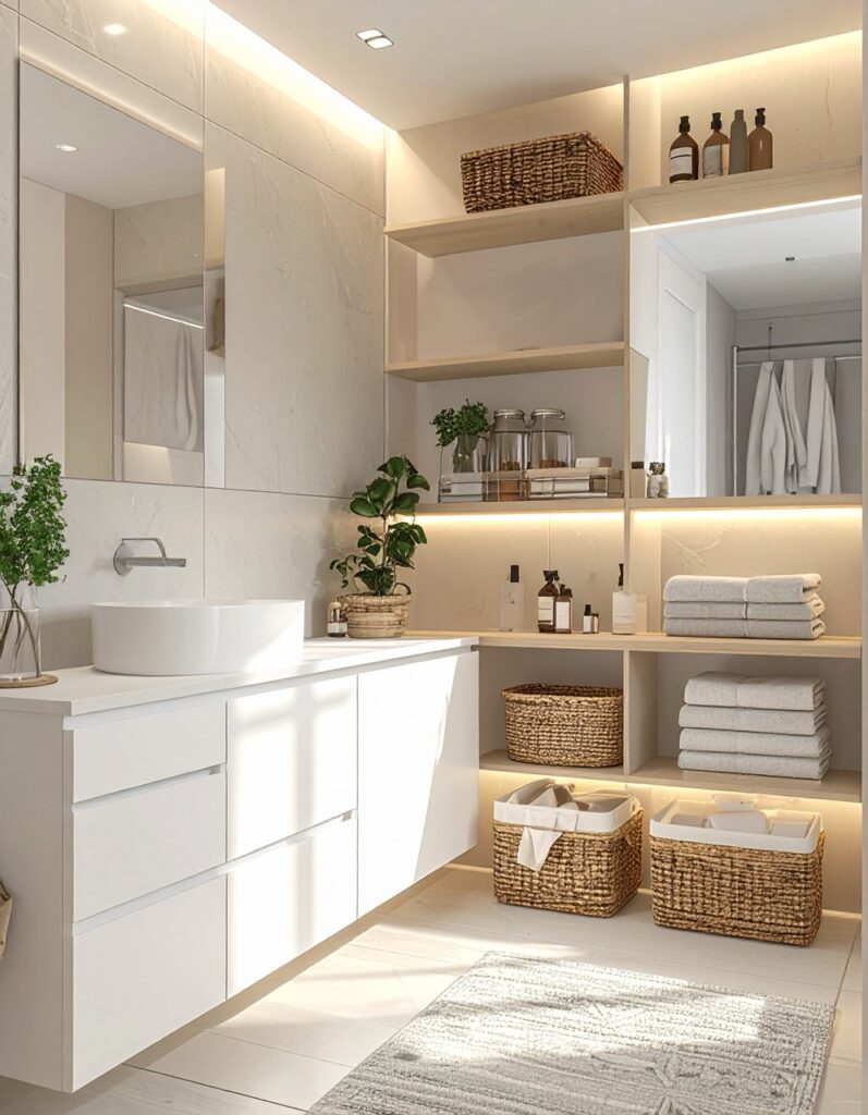 It allows you to neatly store your essentials while styling the space with candles, small plants, or beautiful towels. Not only does it look inviting, but it also makes the bathroom feel more like a living space.